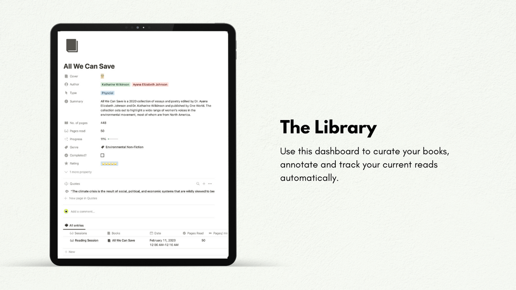An intuitive Book Tracker that curates your library of books, and tracks your progress, book quotes & reading sessions seamlessly. This will help you achieve your reading goal for the year while expanding your knowledge.